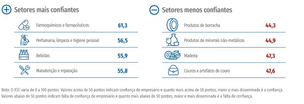 A falta de confiança também permanece nos setores: Couros e artefatos de couro; Madeira; Produtos de Borracha; Produtos de minerais não-metálicos; e Equipamento de informática, eletrônicos e ópticos.