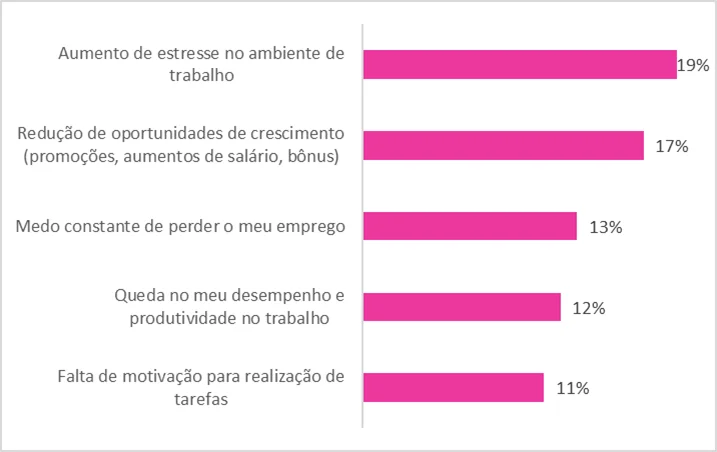 Entre os aspectos que as dificuldades financeiras mais impactaram na vida profissional, está o aumento do estresse no ambiente de trabalho (19%) e a redução de oportunidades de crescimento profissional (17%), os quais foram unânimes entre os dois públicos. Um segundo ponto apontado pelos inadimplentes foi o sentimento de medo constante de perder o emprego (13%).