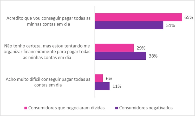 Perguntados se irão conseguir pagar suas contas em dia a partir de agora, 65% do grupo que renegociou dívidas respondeu que sim, enquanto 29% afirmam não ter certeza e 6% não acreditam que isso seja possível. Entre os negativados, 51% estão confiantes em manter suas contas em dia, 38% não têm certeza e 11% acreditam não conseguir arcar com as despesas.
