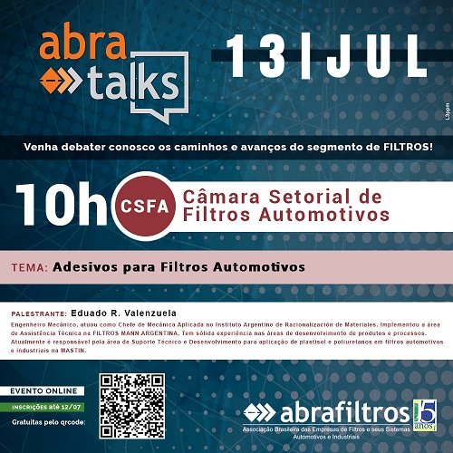 O “Abra Talks”, evento virtual mensal da Abrafiltros – Associação Brasileira das Empresas de Filtros e seus Sistemas – Automotivos e Industriais, terá, no dia 13 de julho (terça-feira), às 10h, como um dos temas, “Adesivos para filtros automotivos”, com Eduardo R. Valenzuela, responsável pela área de suporte técnico e desenvolvimento para aplicação de plastisol e poliuretanos em filtros automotivos e industriais na Mastin. “Os adesivos são fundamentais para garantir a vedação, bem como assegurar a qualidade dos filtros automotivos. É de extrema importância conhecer os processos e aplicações que envolvem esta matéria-prima, indispensável para o segmento”, comenta João Moura, presidente da Abrafiltros, destacando a relevância do tema.