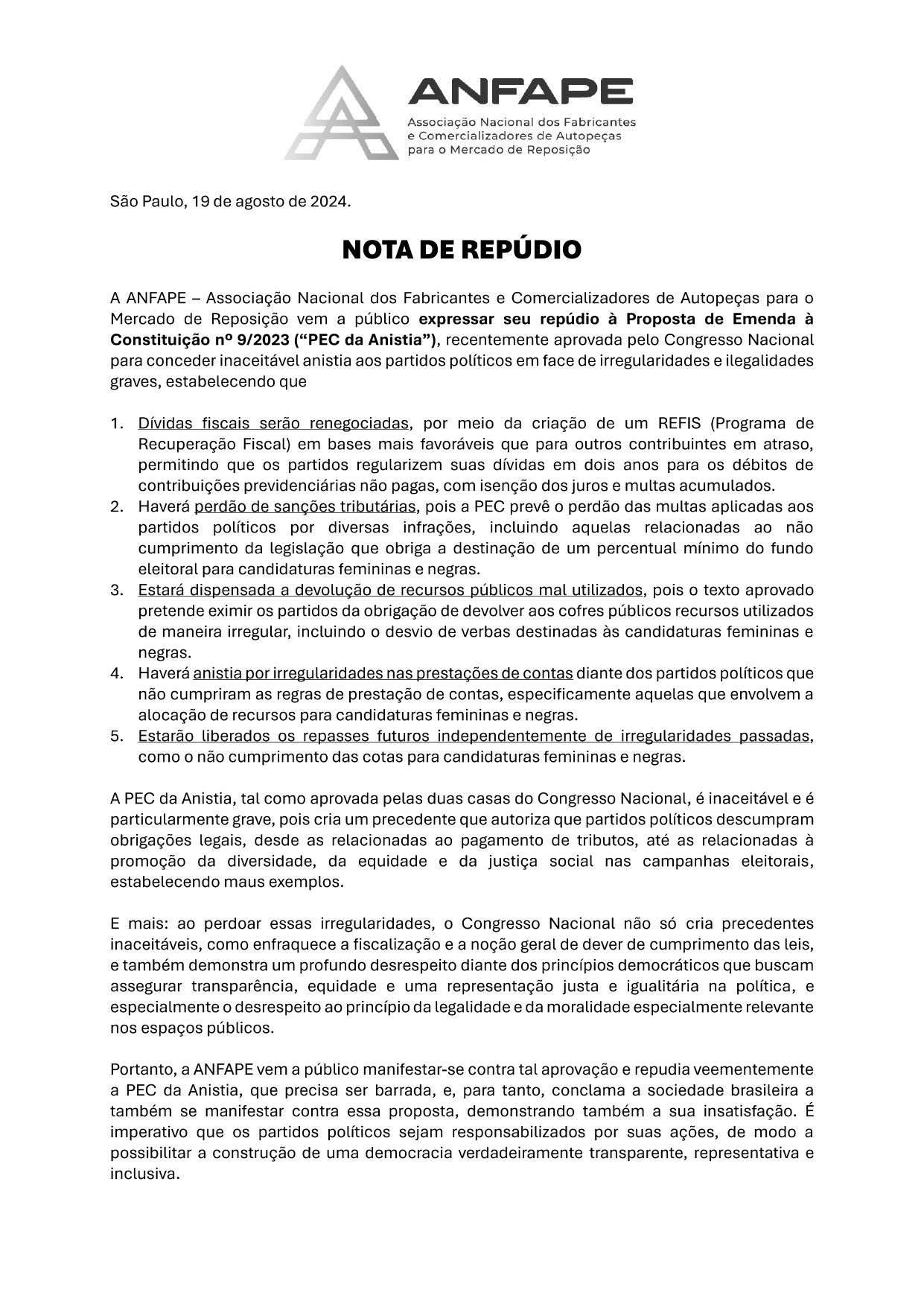 ANFAPE emite Nota de Repúdio contra PEC da Anistia