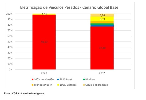 Em 2032, segundo projeções da KGP Automotive Intelligence, espera-se um forte crescimento em todas as categorias de eletrificação e já mostrando uma fatia importante na tecnologia de célula de combustível (hidrogênio). Essa tecnologia tende a ser a solução futura para longas distâncias.