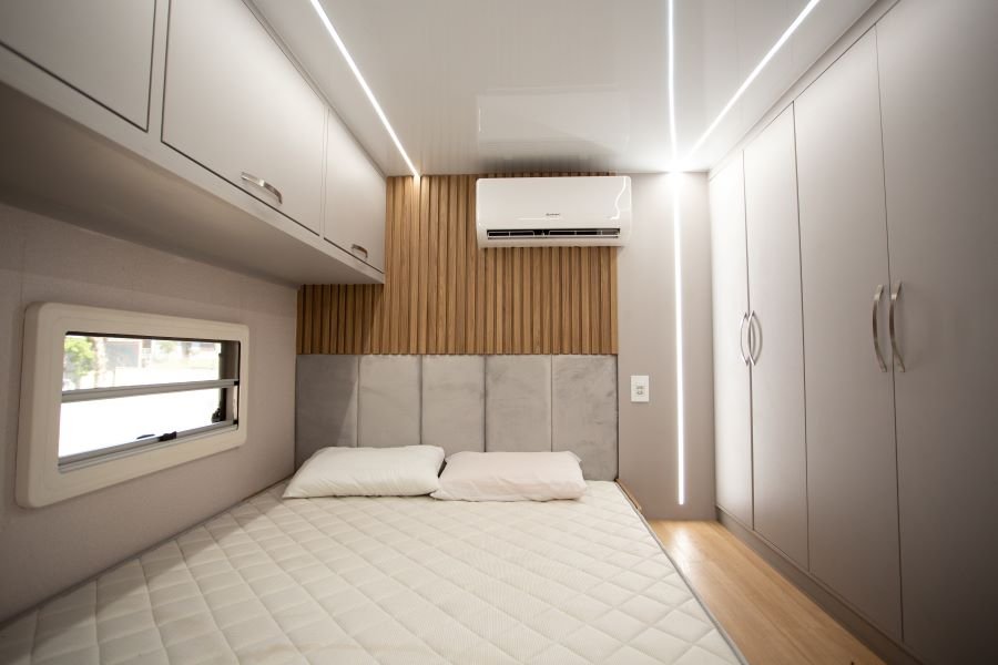 Os 8 metros de comprimento do chassi e a cabine de 2,60m de largura e 2,40m de altura foram essenciais para viabilizar o projeto, que prevê passagem direta entre a cabine e a parte interna da casa, promovendo integração e praticidade. Com capacidade para até seis pessoas, o motorhome é dividido entre quarto, cozinha interna, cozinha externa, banheiro e lavanderia, além de área de convivência. Esse ambiente conta com um sofá em formato de “U”, mesa retrátil, TV de 32 polegadas e ar-condicionado. Um slide-out elétrico, tecnologia que amplia o espaço interno, é possível por conta de um sistema de sapatas niveladoras hidráulicas, acionadas quando o veículo está estacionado.