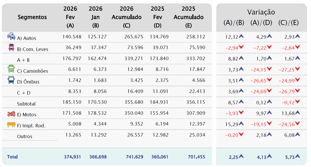 Apesar do avanço frente ao mês anterior o desempenho ainda é negativo no comparativo com fevereiro de 2025: os caminhões acumularam queda de 27,3%, com quase 13 mil emplacamentos e os ônibus registraram retração de 25% na base anual, 3,4 mil unidades.