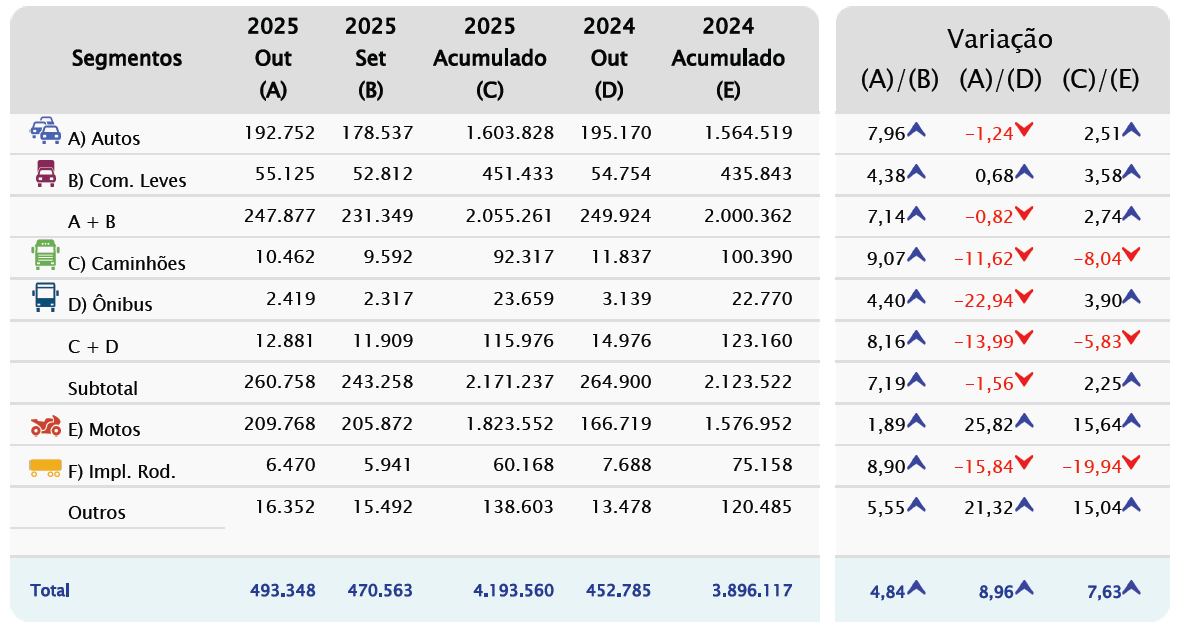 Com impulso do programa as vendas chegaram a 2 milhões 171 mil unidades até outubro, expansão de 2,3% na comparação com igual período do ano passado. Em outubro, que foi o melhor mês de vendas de 2025, foram emplacados 260,8 mil veículos, queda de 1,6% com relação a outubro do ano passado e expansão de 7,2% sobre setembro.