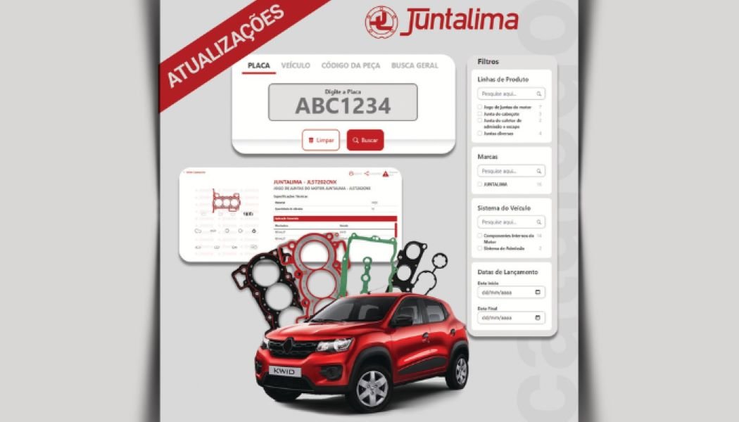 A Juntalima acaba de aprimorar seu catálogo com novas ferramentas de busca, tornando sua experiência ainda melhor. Agora, você pode pesquisar por Placa, Veículo, Código da Junta ou Busca Geral e filtrar os resultados por tipo de produto, marca, sistema do veículo e até data de lançamento para encontrar exatamente o que precisa, com detalhes técnicos, aplicação detalhada e produtos similares à sua disposição. Acesse juntalima.com.br, vá até a seção CATÁLOGOS e economize seu tempo com confiança!