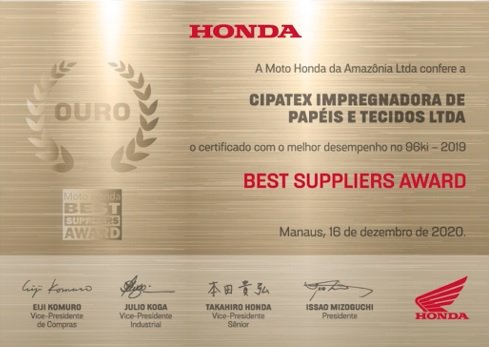 A Cipatex® está entre as melhores fornecedoras da Moto Honda da Amazônia. A empresa, referência em revestimentos sintéticos, foi reconhecida na categoria ouro com o melhor desempenho no 96ki – 2019. O anúncio da premiação foi realizado no último dia 16, por videoconferência. Entre centenas de fornecedores, apenas seis empresas nacionais destacaram-se nessa categoria.