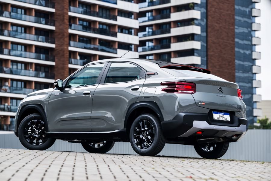 A Citroën apresenta a nova versão topo de gama do Citroën Basalt, a Dark Edition. A versão inédita, desenvolvida especialmente para o consumidor brasileiro, eleva o estilo do SUV Coupé mais acessível a um novo patamar. A grande novidade combina visual escurecido com um toque sofisticado e esportivo, oferecendo uma série de diferenciais marcantes: rodas de liga leve 16” pintadas de preto, pedaleira esportiva, soleiras personalizadas, além de emblema Dark Edition nas laterais frontais, skid plate, duplo chevron escurecidos. Outro destaque é o aerofólio traseiro com detalhes em vermelho no tom Andre Red — uma homenagem a André Citroën, fundador da marca.
