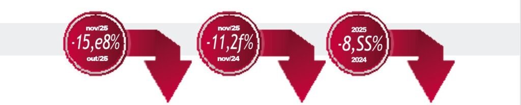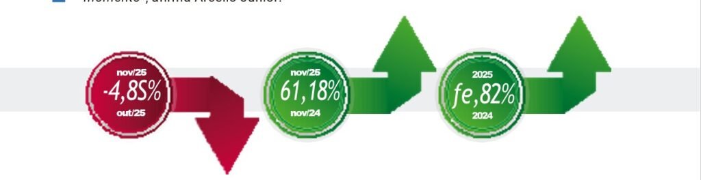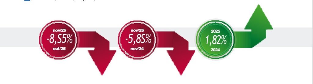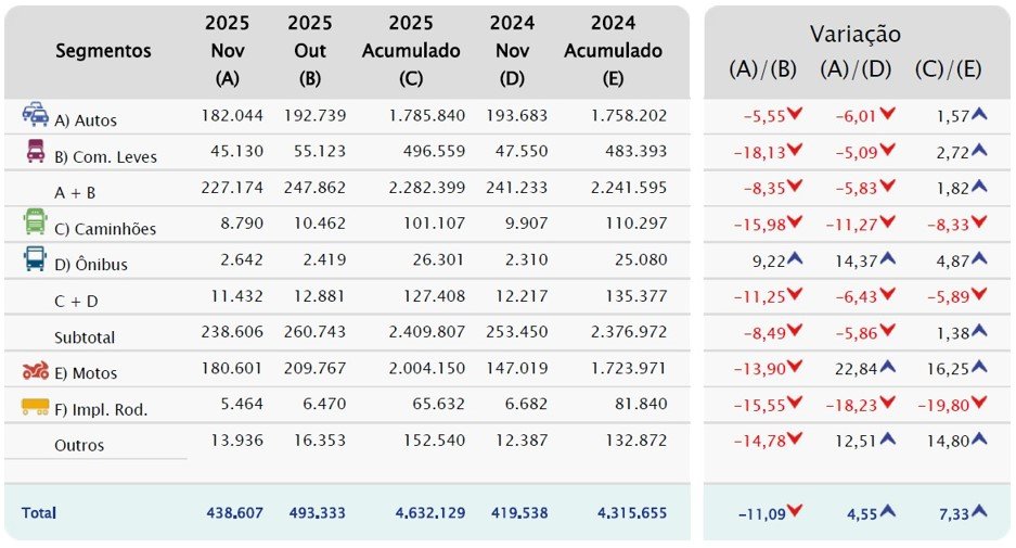 Se considerarmos a comparação entre novembro/2025 e novembro/2024, ambos com igual número de dias úteis, houve alta de 4,5%. No acumulado dos 11 meses de 2025, o setor já registra 4.632.129 veículos emplacados, um crescimento de 7,3% na comparação com igual período de 2024 (4.315.655 unidades).