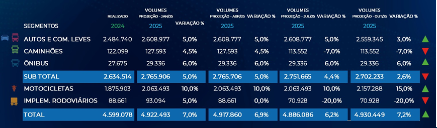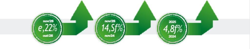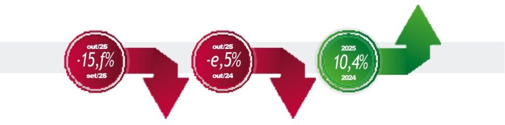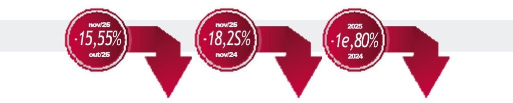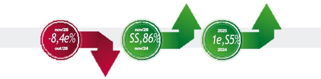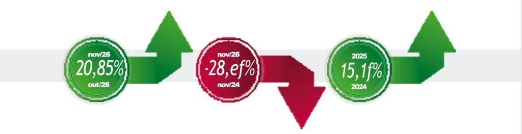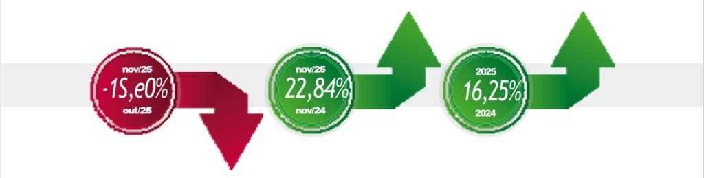 Considerando o período de janeiro a novembro, o setor, em geral, já alcançou a estimativa de crescimento estimado pela Fenabrave. A entidade comentará os resultados finais de 2025, na Coletiva de Imprensa que será realizada em janeiro de 2026.