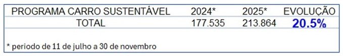 Desde o seu lançamento, em 10 de julho, até o dia 30 de novembro, os veículos participantes do Programa Carro Sustentável apresentaram desempenho acumulado 20,5% acima dos resultados apurados no mesmo período de 2024. Foram comercializadas 213.864 unidades, contra 177.535, na comparação entre 10 de julho e 30 de novembro, em 2025 e 2024, respectivamente.