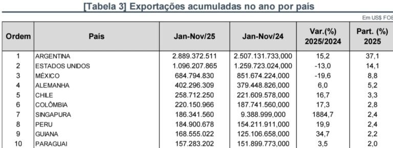 Em novembro, por exemplo, as exportações somaram US$ 681,3 milhões, queda de 3,1% frente a igual mês de 2024, puxada pela performance negativa para os Estados Unidos (-32,1%), México (-25,0%) e também a Argentina (-15,3%).