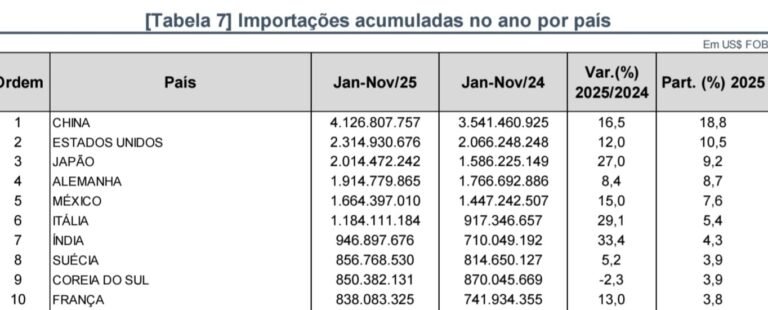 Importante registrar que em contraste com a queda das exportações em novembro, as importações seguiram em alta. Cresceram 10,9% sobre o mesmo mês de 2024, atingindo US$ 1,9 bilhão.