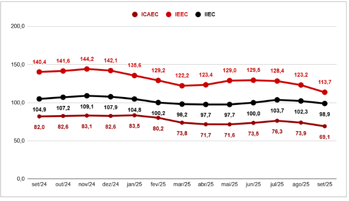 Voltando para a zona de pessimismo, o IIEC passou de 102,3 pontos, em agosto, para 98,9 pontos, em setembro — queda de 3,2%. Na avaliação da FecomercioSP, com o indicador flutuando em torno dos 100 pontos nos últimos meses, os empresários estão adotando uma postura mais cautelosa em relação a novos investimentos frente à insegurança e aos juros elevados.