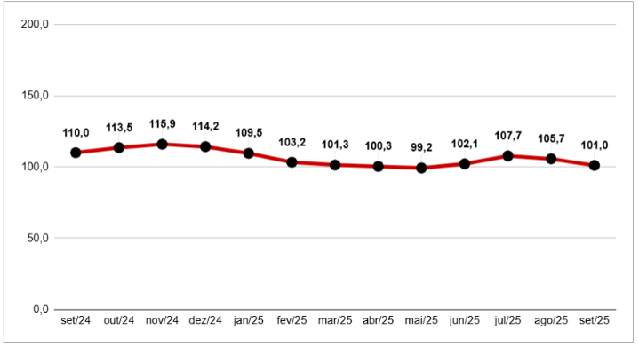 O Índice de Expansão do Comércio do Município de São Paulo (IEC), também medido pela FecomercioSP, registrou, em setembro, a segunda retração consecutiva. O indicador recuou 4,4%, passando de 105,7 para 101 pontos [gráfico 3].