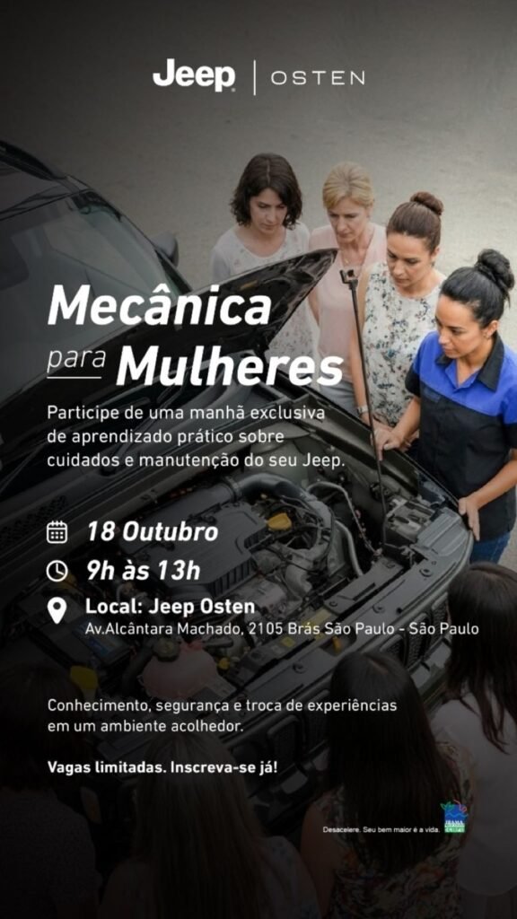 Mulheres que dirigem carros da marca Jeep podem conhecer um pouco mais sobre o funcionamento do seu veículo no evento que a Osten Motors – operação de concessionárias da Osten Group – realiza neste sábado (18/10). Na ocasião, a Osten vai oferecer o curso gratuito “Mecânica para Mulheres”, dentro das ações do Outubro Rosa, mês dedicado à prevenção e ao combate ao câncer de mama.