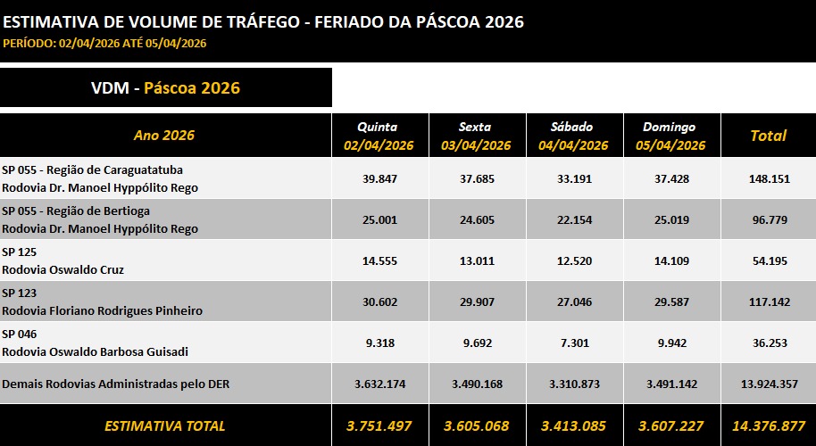 O Departamento estima que o movimento do feriado tenha um aumento de 20,3% em comparação ao número de usuários que passaram pelos mesmos trechos durante a Páscoa de 2025.