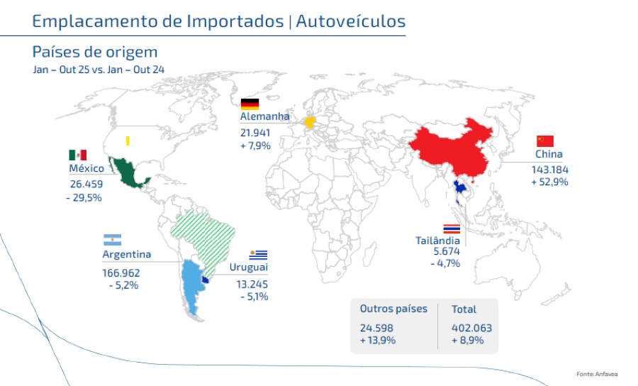 No acumulado dos dez primeiros meses do ano, foram emplacados 402 mil unidades importadas, crescimento de 8,9%. Modelos chineses responderam por 143,2 mil emplacamentos, 53% a mais do que em igual período de 2024.