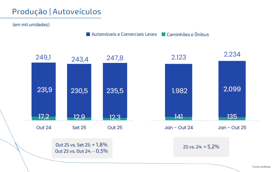 Indicador mais importante do atual quadro é a somatória dos dez primeiros meses de 2025. Nesse período, a produção acumulada superou 2,23 milhões de veículos leves e pesados, crescimento de 5,2% diante do resultado de janeiro a outubro do ano passado.