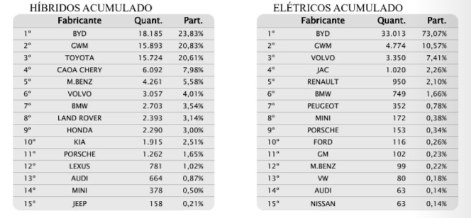Já a BYD estabeleceu outro patamar. Só de elétricos puros vendeu 33,1 mil automóveis e comerciais leves. Na soma com os híbridos, chega a 51,3 mil eletrificados, 42% do segmento, e volume  que a coloca como a décima colocada no ranking geral de marcas.