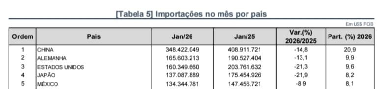 A China segue na liderança das importações, com participação de 20,9%, mas houve queda nas compras da ordem de 14,8%. Foram US$ 348,4 milhões, frente aos US$ 408,9 milhões do mesmo mês de 2025.