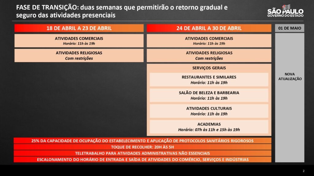 O governo do Estado de São Paulo confirmou em entrevista coletiva de sexta-feira, 23 de abril, que mais atividades voltam a funcionar a partir deste sábado (24).