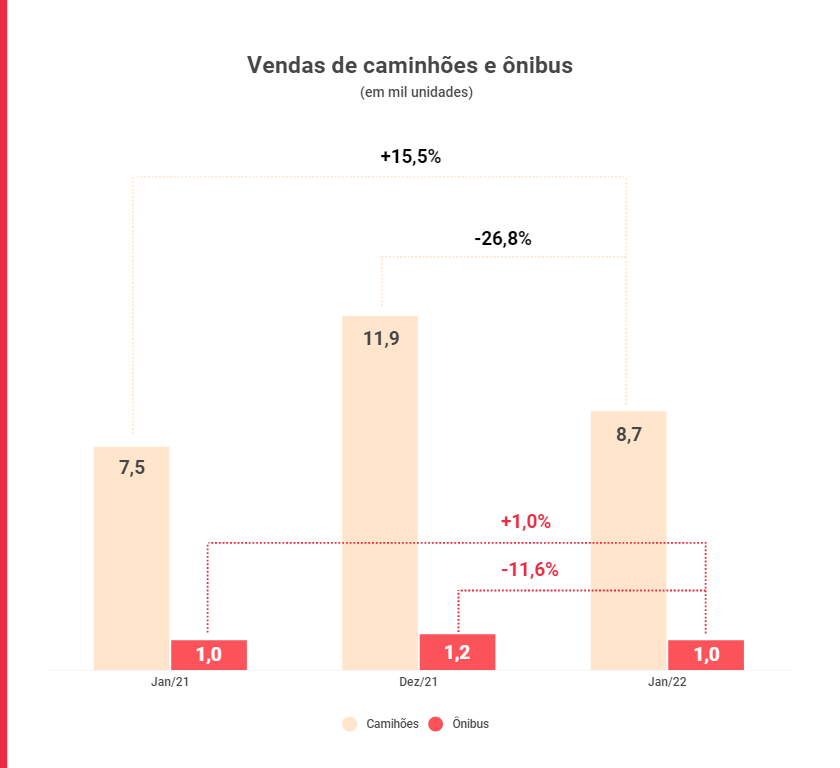 As vendas locais registraram em janeiro 8,7 mil caminhões emplacados. O confronto com dezembro indica queda de 26,8%, mas ante janeiro de 2021 se vê uma alta de 15,5%. Como comparação, a venda de ônibus avançou somente 1% em janeiro e os veículos leves (automóveis e comerciais) recuaram quase 30% no confronto com janeiro do ano passado.