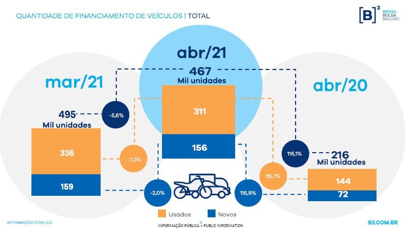 De acordo com dados da B3, as vendas financiadas de veículos em abril de 2021 somaram 467 mil unidades, entre novas e usadas. O número, que inclui autos leves, motos e pesados em todo o País, representa aumento de 116,1% se comparado a abril de 2020, quando os financiamentos de veículos somaram 216 mil unidades.