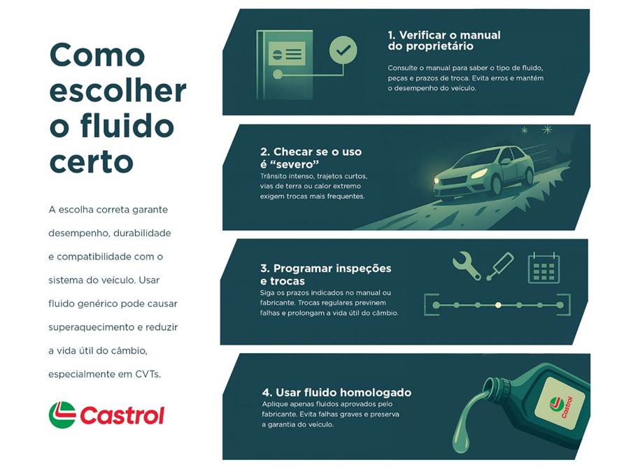 De acordo com o especialista da Castrol, a primeira fonte de orientação deve ser sempre o manual do proprietário. Nele, as montadoras deixam claro quando inspecionar o fluido, em que condições o prazo pode ser encurtado e qual especificação usar na substituição. A partir daí, a escolha do produto correto faz a diferença para manter o carro em pleno funcionamento, prolongando a vida útil do conjunto e evitando dores de cabeça futuras.