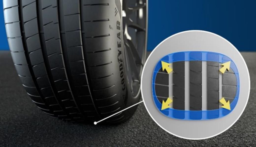 Além disso, as inovações do Eagle F1 Asymmetric 6 incluem uma forma aerodinâmica da parede lateral para gerenciar a turbulência e o fluxo de ar ao redor do pneu e da lateral do veículo.