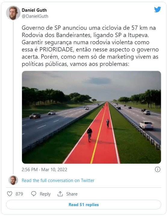 Guth ainda lembra que Doria está a um mês de se licenciar do governo estadual para disputar a eleição presidencial e questiona o porquê de essa obra ter sido anunciada após três anos da gestão do político no cargo sem nenhuma ciclovia interestadual ser feita.