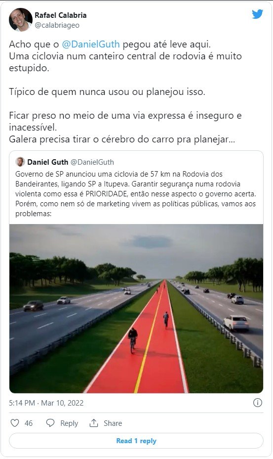 O coordenador de Mobilidade do Idec (Instituto de Defesa do Consumidor), Rafael Calabria, respondeu Guth e também criticou a ciclovia. “Uma ciclovia num canteiro central de rodovia é muito estúpido”, disse ele. “Típico de quem nunca usou ou planejou isso. Ficar preso no meio de uma via expressa é inseguro e inacessível”, afirmou.