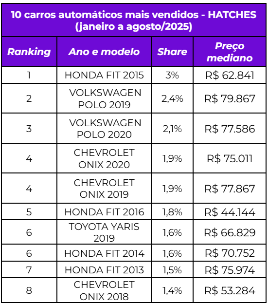 Após o Civic 2014, o Honda City 2015 é o segundo sedã automático mais vendido entre janeiro e agosto, com 1,5% de participação, e preço mediano de R$ 64.396 no período. Dois modelos dividem a terceira colocação com 1,3% de participação cada: o Chevrolet Onix 2020 (por R$ 70.744) e Honda Civic 2016 (R$ 77.856).