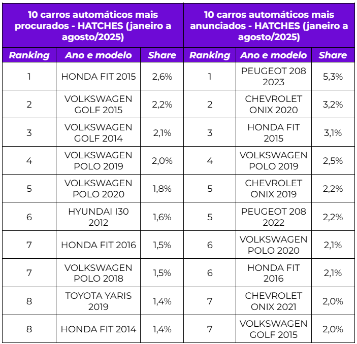 O Peugeot 208 2023 é o hatch automático mais anunciado no período, com 5,3% de participação, seguido pelo Chevrolet Onix 2020, com 3,2%, e pelo Honda Fit 2015, com 3,1%.