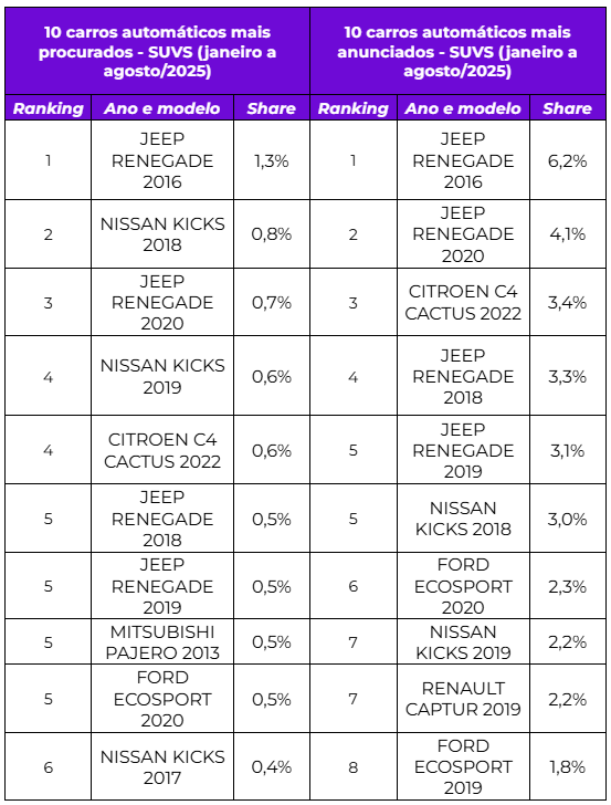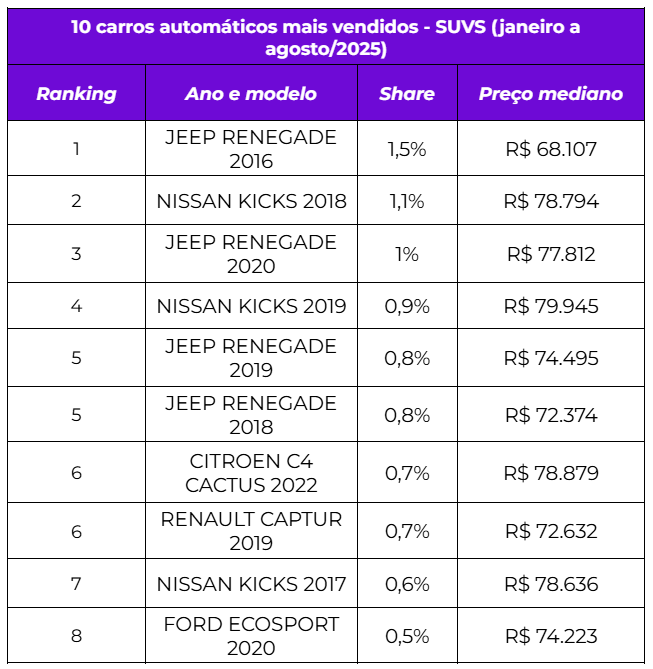 O Jeep Renegade 2016 foi o carro automático mais comercializado dentre os SUVs, com 1,5% de share e preço mediano de R$ 68.107. O Nissan Kicks 2018 vem em segundo lugar, com 1,1%, e custando cerca de R$ 78.794 no período. Renegade 2020 ocupa o terceiro lugar, com 1%, e por R$ 77.812.