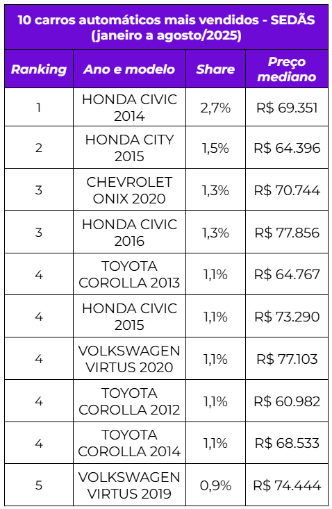 O Honda Civic 2014 é o mais procurado dentre os sedãs automáticos, com 2,5% de share. O Honda Civic 2016 e o Toyota Corolla 2014 dividem a segunda colocação, com 1,3% cada. O Corolla 2012 ocupa a terceira posição, com 1,2%.