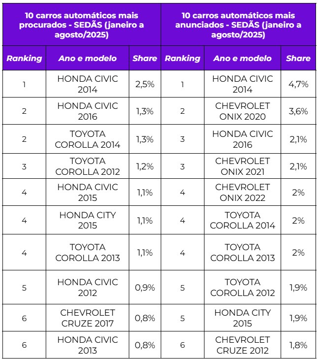 O Civic 2014 também lidera dentre os sedãs automáticos mais anunciados no período, com 4,7% de participação, seguido pelo Chevrolet Onix 2020, com 3,6%. O Honda Civic 2016 e o Chevrolet Onix 2021 ficam em terceiro, com 2,1% cada.