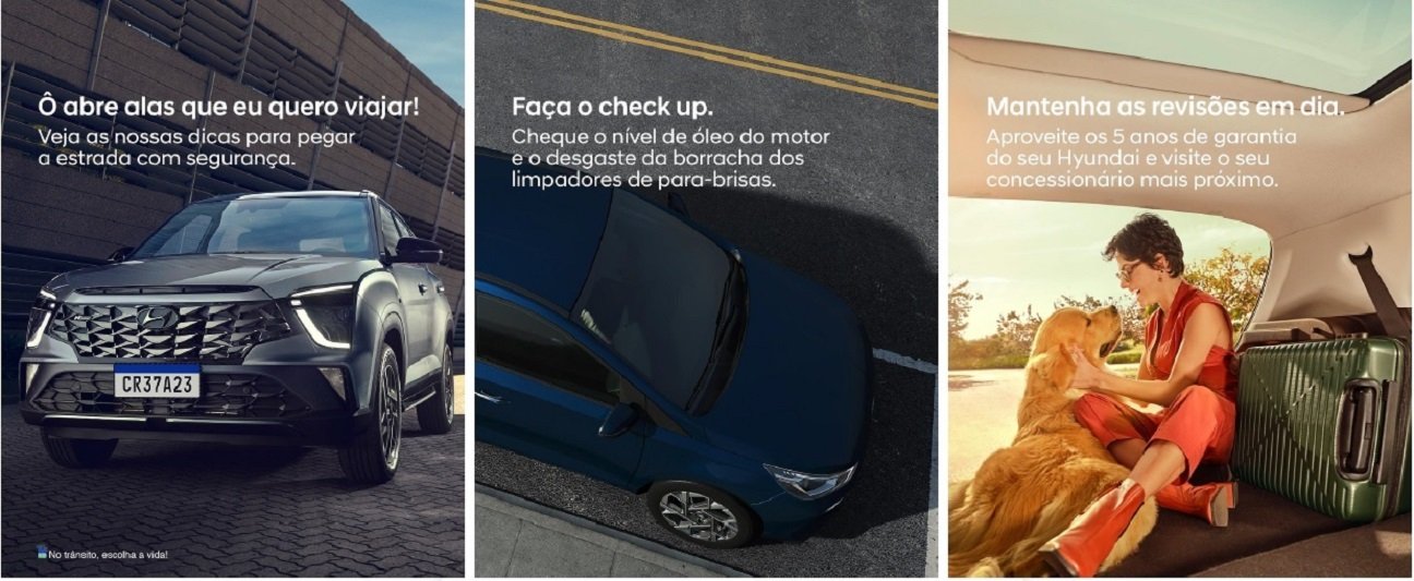 A Hyundai iniciou nesta semana, em suas redes sociais, a campanha digital com postagens que visam alertar os motoristas para pontos de atenção no veículo antes de pegar a estrada, às vésperas do feriadão de Carnaval. Sob a hashtag #DicasHyundai, estão sendo compartilhados alguns itens básicos a serem conferidos pelo condutor do veículo antes de iniciar viagem como, por exemplo, o nível de óleo do motor, o desgaste das borrachas do limpador de para-brisa e as lâmpadas, entre outros.