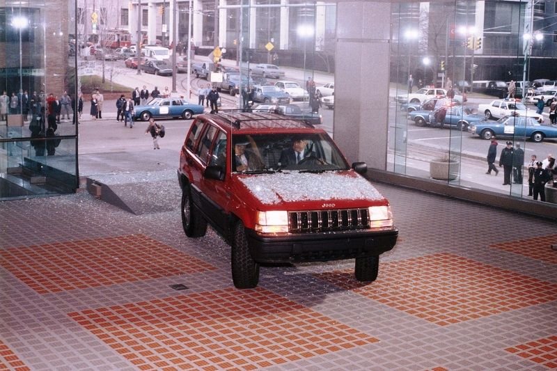 O Grand Cherokee teve uma estreia triunfal, isso porque apareceu pela primeira vez ao quebrar o vidro do centro de convenções no Salão do Automóvel Internacional em Detroit durante sua apresentação lá em 7 de janeiro de 1992.