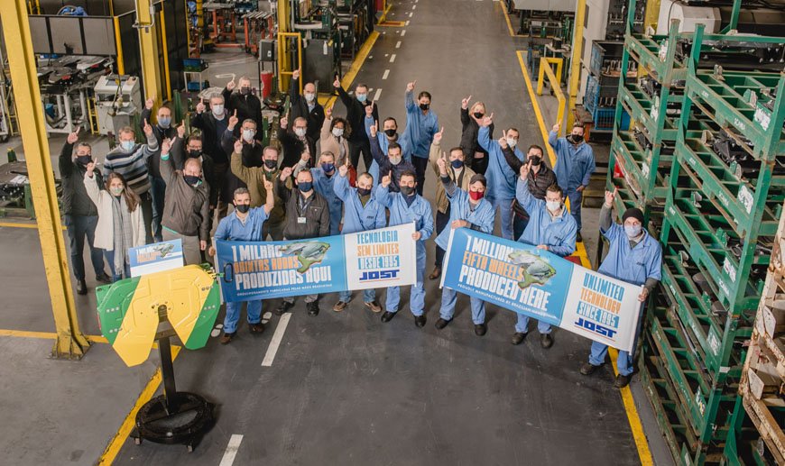 A Jost Brasil, empresa sediada em Caxias do Sul (RS) e integrante do grupo Randon, alcançou a importante marca de 1 milhão de quintas rodas produzidas desde a sua criação, em 1995. Para celebrar o feito histórico, a empresa providenciou a personalização de uma peça, que ficará exposta na fábrica para que a equipe de colaboradores possa assiná-la, fazer fotos e providenciar registros nas redes sociais. A quinta roda é um equipamento que faz a ligação entre o caminhão e carreta.