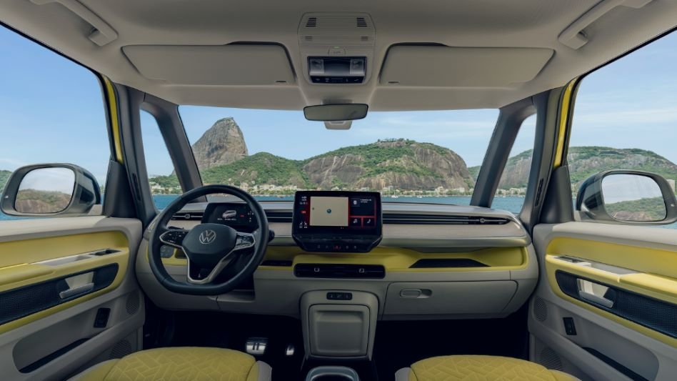 Motorista e passageiros têm uma imersão em tecnologia quando acessam o interior da Kombi Elétrica. A começar pelo assistente de comunicação inteligente com iluminação bidirecional via LED (ID Light). Com ele é possível solicitar algumas funções por voz, como o uso do ar-condicionado digital de duas zonas. A câmera 360° é ótimo auxílio para ver os arredores da Nova Senhora, mas estacionar, por exemplo, não será uma preocupação a bordo da minivan, que traz sistema de estacionamento semi-autônomo. Funciona assim: a partir do acionamento do item pela central multimídia “Ready 2 Discover “, com tela de 12 polegadas, é possível acessar uma vaga sem precisar controlar pedais ou câmbio. Trata-se do Memory Park Assist Plus. Há ainda uma assistente traseiro transversal de saída de vaga. E sim, o ID Buzz é um verdadeiro piloto quando se trata de baliza!