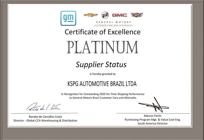 A Kolbenschmidt (KS), marca premium de componentes de motor com presença global, recebeu o prêmio anual de Excelência em Qualidade de Fornecedores da General Motors Brazil, categoria platinum, em reconhecimento ao excelente desempenho de entrega em 2020. A marca alemã figura entre os melhores fornecedores da montadora.