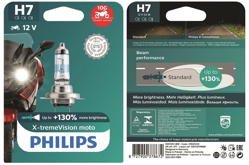 Enxergar mais adiante quando se está a bordo de motocicletas especialmente nas estradas pode ser crucial para antecipar-se de imprevistos. O modelo da Philips, que utiliza gás especial e pressão diferenciada para potencializar a performance, é ideal para motocicletas de 600 à 1300 cilindradas. A lâmpada também foi projetada para resistir fortes vibrações. A Philips X-tremeVision Moto está disponível nos formatos H4 e H7 de 12V.