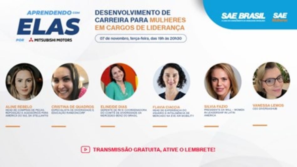 A última live do ano desta série ocorre nesta terça-feira, dia 07 de novembro, a partir das 19h, com transmissão gratuita pelo canal do YouTube da SAE BRASIL. Para assistir a live “Aprendendo com Elas por Mitsubishi Motors | Mulheres em Cargos de Liderança”, clique aqui.