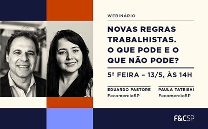 Para deixar todos por dentro das mudanças, participam do webinário os assessores jurídicos da FecomercioSP Paula Tateishi e Eduardo Pastore, que falam sobre o que muda, o que não muda, e em como evitar complicações legais antes de tomar qualquer decisão. Ao final do debate, os especialistas estarão à disposição do público para esclarecer todas as dúvidas. Os interessados podem se cadastrar no link: https://representa.fecomercio.com.br/webinarios.