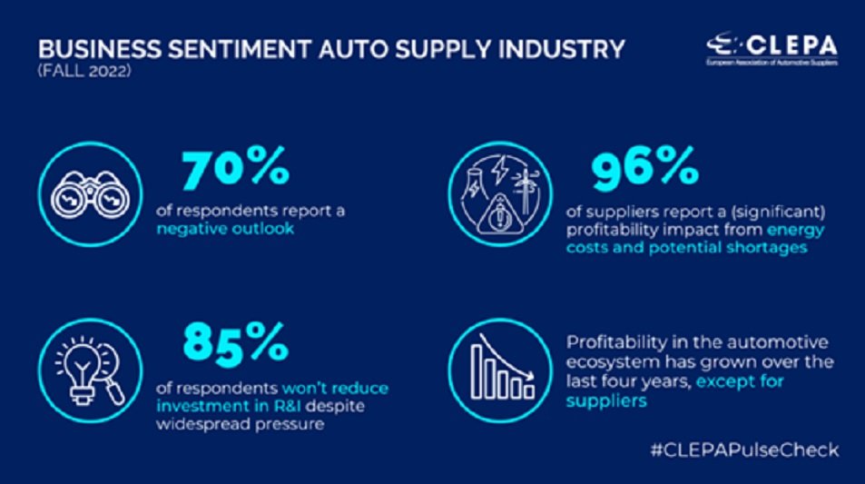 “O Pulse Check documenta claramente a pressão que os fornecedores automotivos estão enfrentando, que pode piorar durante o inverno. Com quase 70% dos fornecedores operando muito abaixo das margens EBIT de 5%, o financiamento da transição verde e digital está se tornando cada vez mais desafiador. Os fornecedores mantêm firme seu compromisso com os gastos em P&I, mas sem acesso à energia acessível na UE e divisão justa do fardo da inflação ao longo da cadeia de suprimentos, a competitividade e a velocidade da inovação no setor diminuirão”, diz o secretário-geral da CLEPA, Benjamin Krieger .