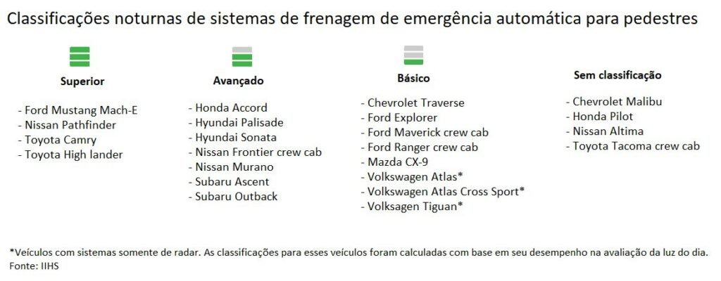 Um novo estudo do Instituto de Seguros para Segurança Rodoviária dos EUA (IIHS, em inglês) concluiu que a maioria dos sistemas de frenagem automática para pedestres não funciona tão bem à noite – quando ocorre a maior parte dos atropelamentos fatais. Apenas 4 dos 23 modelos de carros médios, SUVs e picapes pequenas testadas atingiram a classificação máxima. Mais da metade dos veículos tiveram pontuação baixa ou zerada.