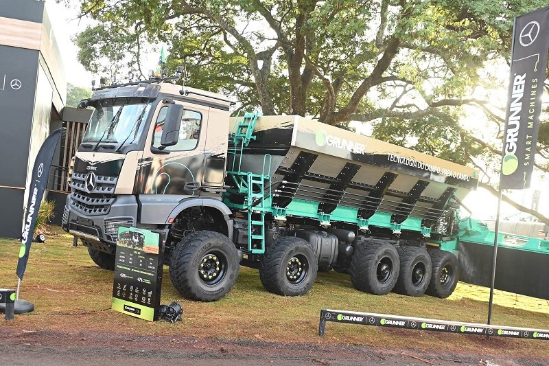 Segundo a Mercedes, a nova máquina é resultado de “dois anos de incursões realizadas pela Grunner na região produtora de grãos do sudoeste goiano e no Mato Grosso, contando com a participação de clientes que apontaram suas principais necessidades no dia a dia do campo”.