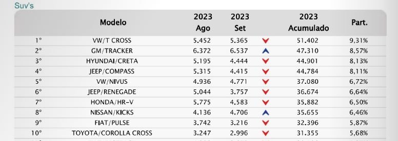 Em setembro, Volkswagen e Jeep venderam, respectivamente, 11,5 mil e 9,7 mil SUVs. Mas coube ao Chevrolet Tracker o melhor resultado e a liderança no mês, com mais de 6,5 mil emplacamentos, seguido do T-Cross, com quase 5,4 mil.