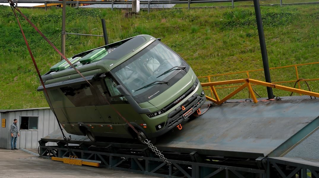 O NOMADE foi integralmente projetado para atender a esse tipo de exigência, com engenharia que prioriza a estabilidade estrutural e centro de gravidade otimizado, garantindo desempenho superior e nível de segurança acima do padrão. Essa validação reforça o compromisso da Marcopolo com a inovação e a segurança no segmento de motorhomes, posicionando o modelo como referência no mercado.